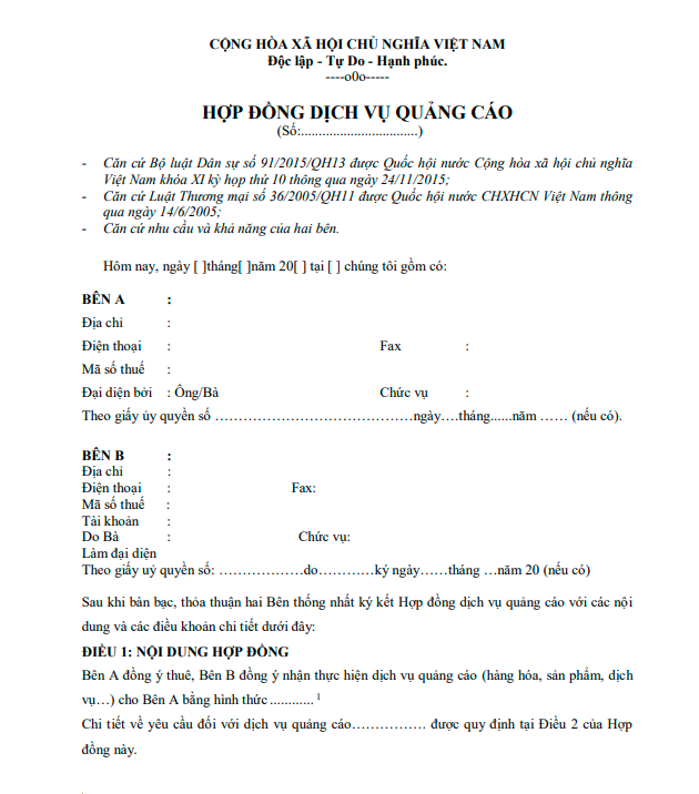 - Hợp đồng dịch vụ quảng cáo với đối tác.