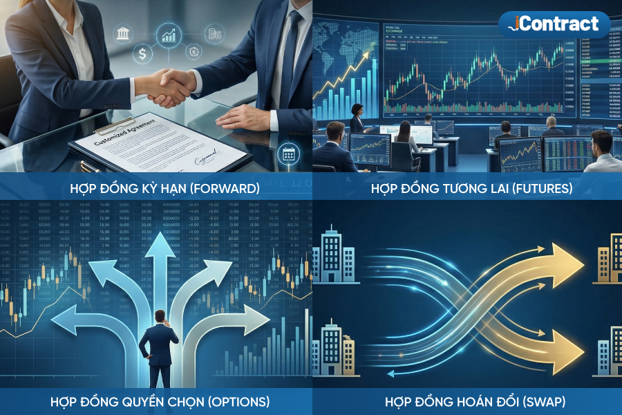 - Hợp đồng kỳ hạn (Forward): Thỏa thuận mua/bán tài sản tại thời điểm tương lai với mức giá xác định trước.