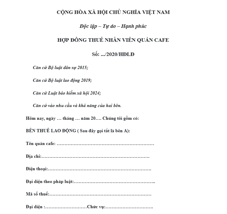 2. Các mẫu hợp đồng thuê nhân viên quán cafe (File Word/PDF)