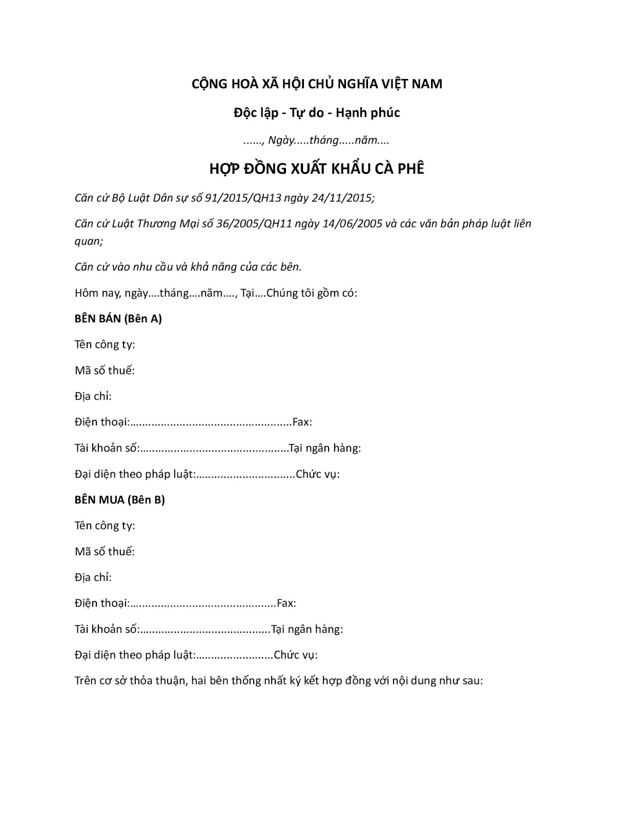 Dưới đây là mẫu hợp đồng xuất khẩu cà phê tham khảo: