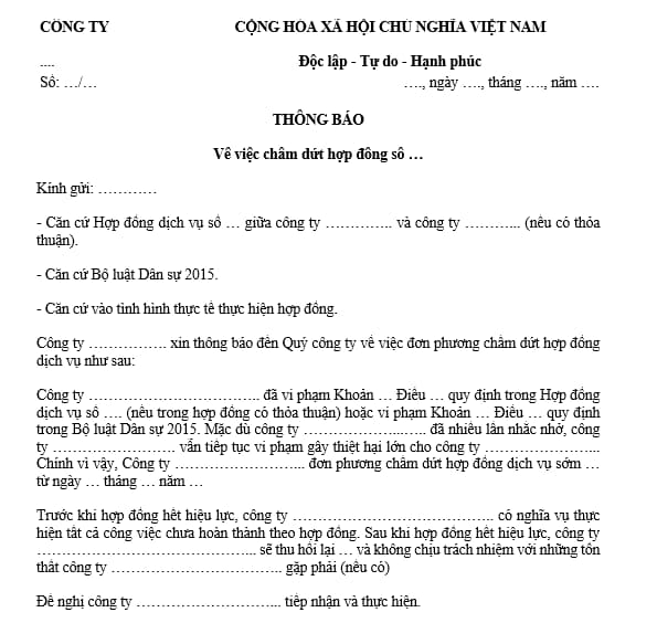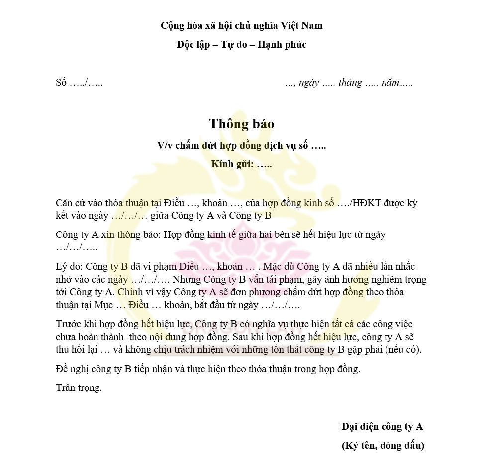 Mẫu thông báo chấm dứt hợp đồng dịch vụ mới nhất 2025